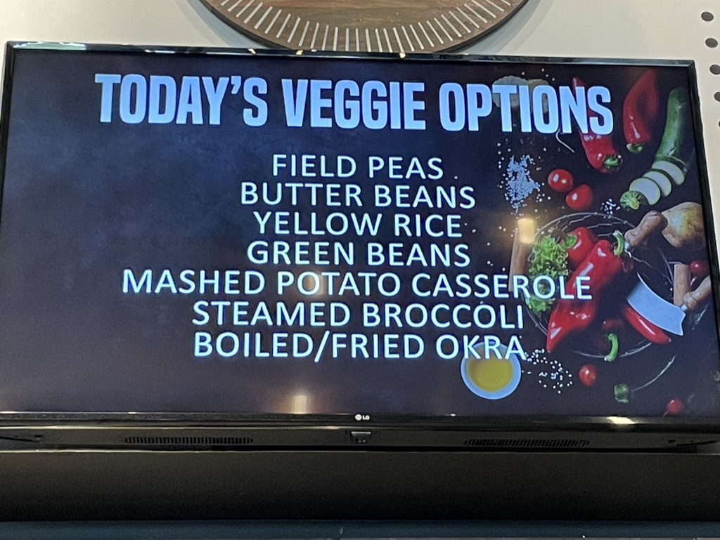 The 4 veggie plate consists of 4 of our vegetable options. This meal comes with bread and a beverage