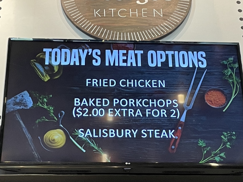 The 1 meat, 3 veggies, and 1 dessert plate consists of 1 of our meat selections, 3 of our veggie selections, and 1 of our dessert options. This meal comes with bread and a beverage